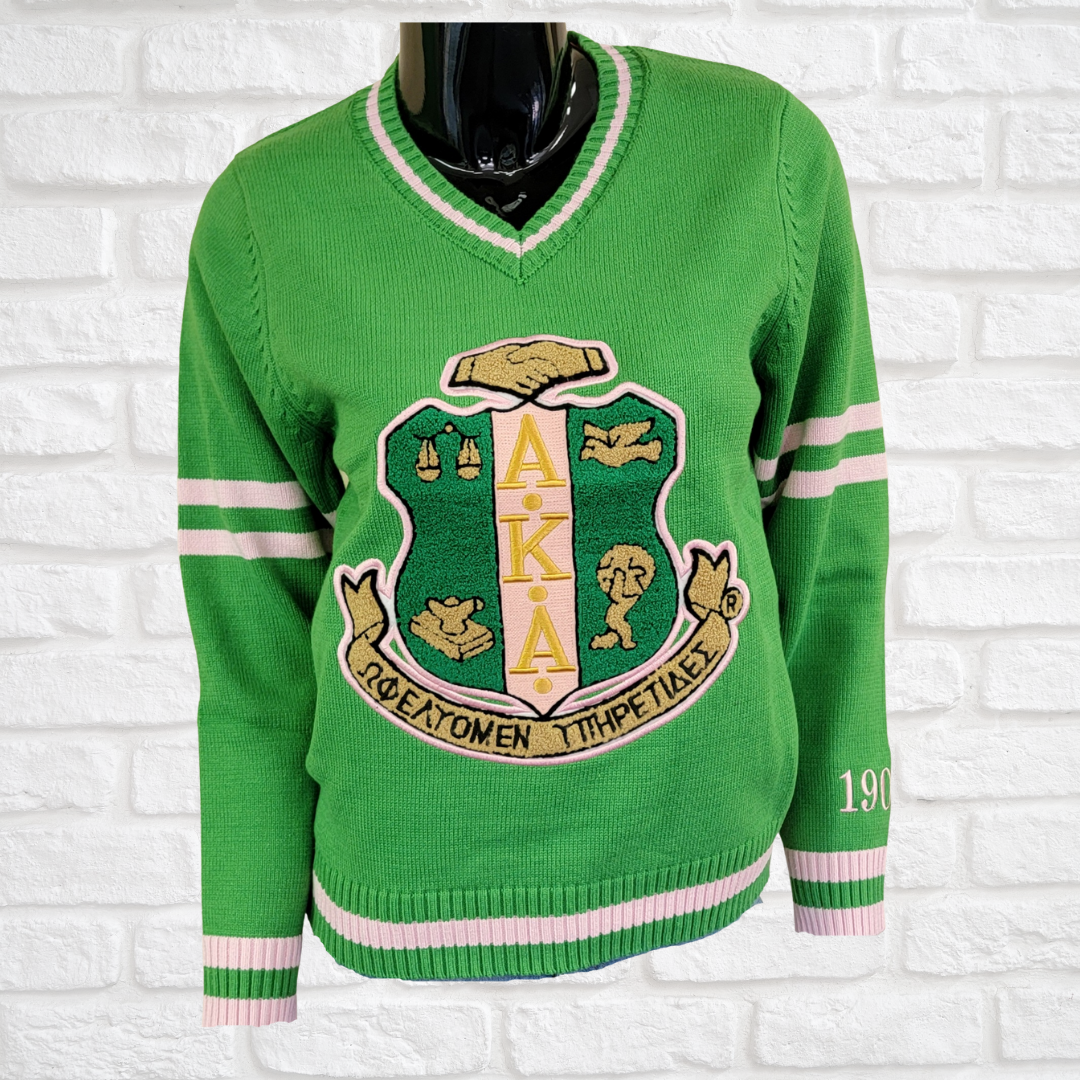 Varsity style sweater with a Chenille crest and founding year at the cuff of the sleeve