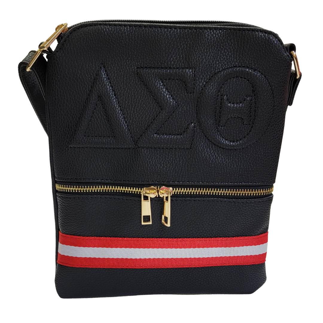 The Black Crossbody has a pink and green contrasting ribbon across the front with a double zipper.